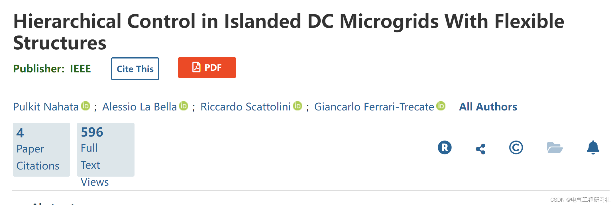 在这文中,为孤立的 DCmG 提出了一种自上而下的分层控制结构。我们位于初级电压层之上的监控控制器包括二级和三级。通过使用负载/发电预测以及绘制的测量值从负载和 DGU 中,我们配备 EMS 的第三层产生最佳的电源参考。为了使 EMS 电源参考对电压控制的初级层有意义,次级层将它们转换为适当的电压参考。更具体地说,电压参考是通过优化问题生成的,该问题能够结合实际操作约束,如 DGU 能力限制和 DCmG 允许电压范围。我们研究了二次优化问题的完全占有性,并推导出了发电机电压和 DGU 功率注入唯一性的新条件。最后,在 16 节点 DCmG 上,我们演示了我们的分层控制方案的多个层如何协同工作以实现预期目标。未来的工作将针对 EMS 的开发,使 DCmG 能够在并网模式下工作,并且不需要完全了解 DCmG 拓扑的辅助层。为了设计一个完全可扩展的 DCmG 控制架构,我们也将努力转向二级和三级控制层的去中心化方向。