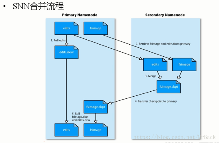 当edits.log达到一定极限时(达到配置文件fs.checkpoint.period配置的时间间隔,默认3600S。或者fs.checkpoint.size设置的最大值,默认64M),由SecondaryNameNode节点将edits.log与fsimage进行合并成为fsimage.ckpt.然后将其返回给NameNode中替换fsimage.