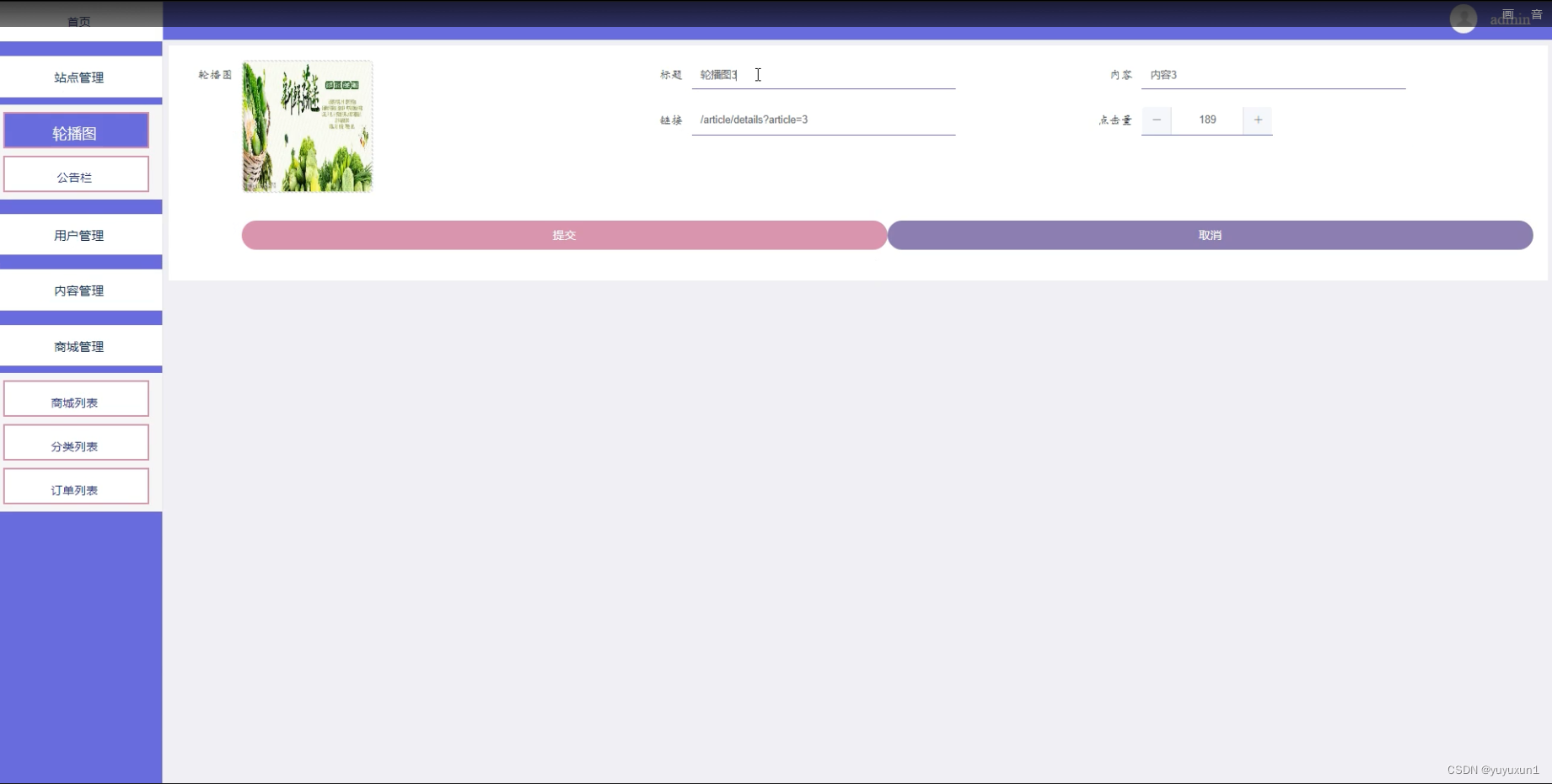 商品:存放给商品的内容,包括封面图、原价、商品分类、商品库存等数据项。