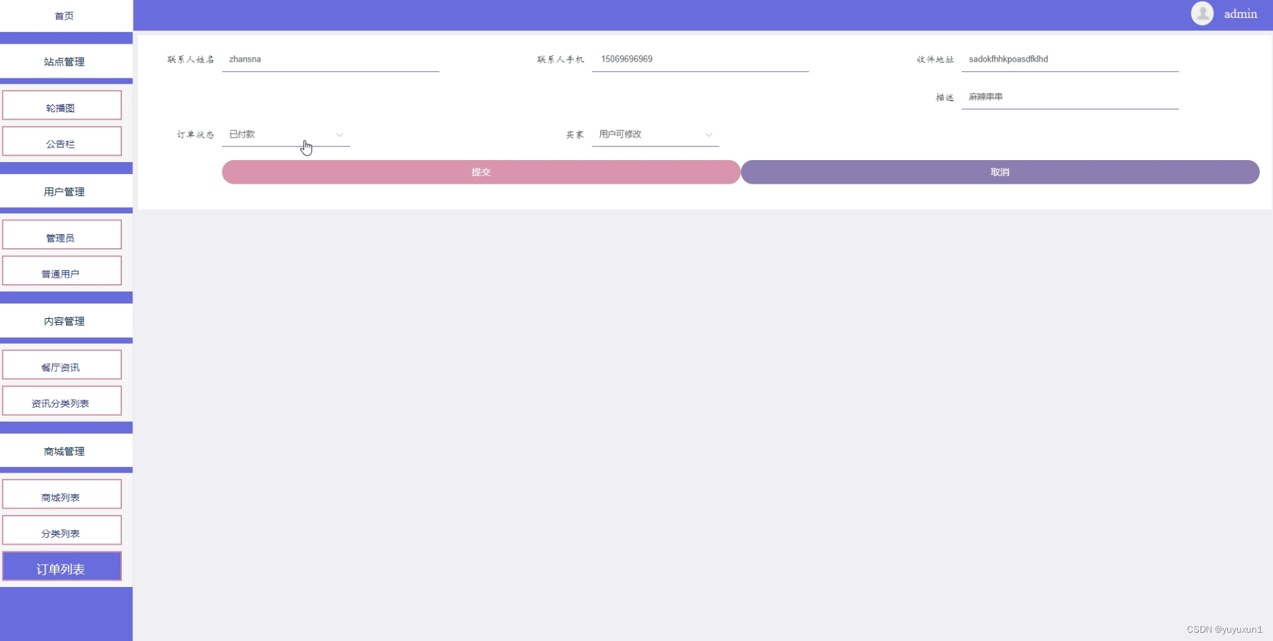 订单列表管理模块:订单列表管理分为订单添加、修改和就餐。订单信息由管理员进行修改、添加、删除操作;就餐由普通用户来执行。