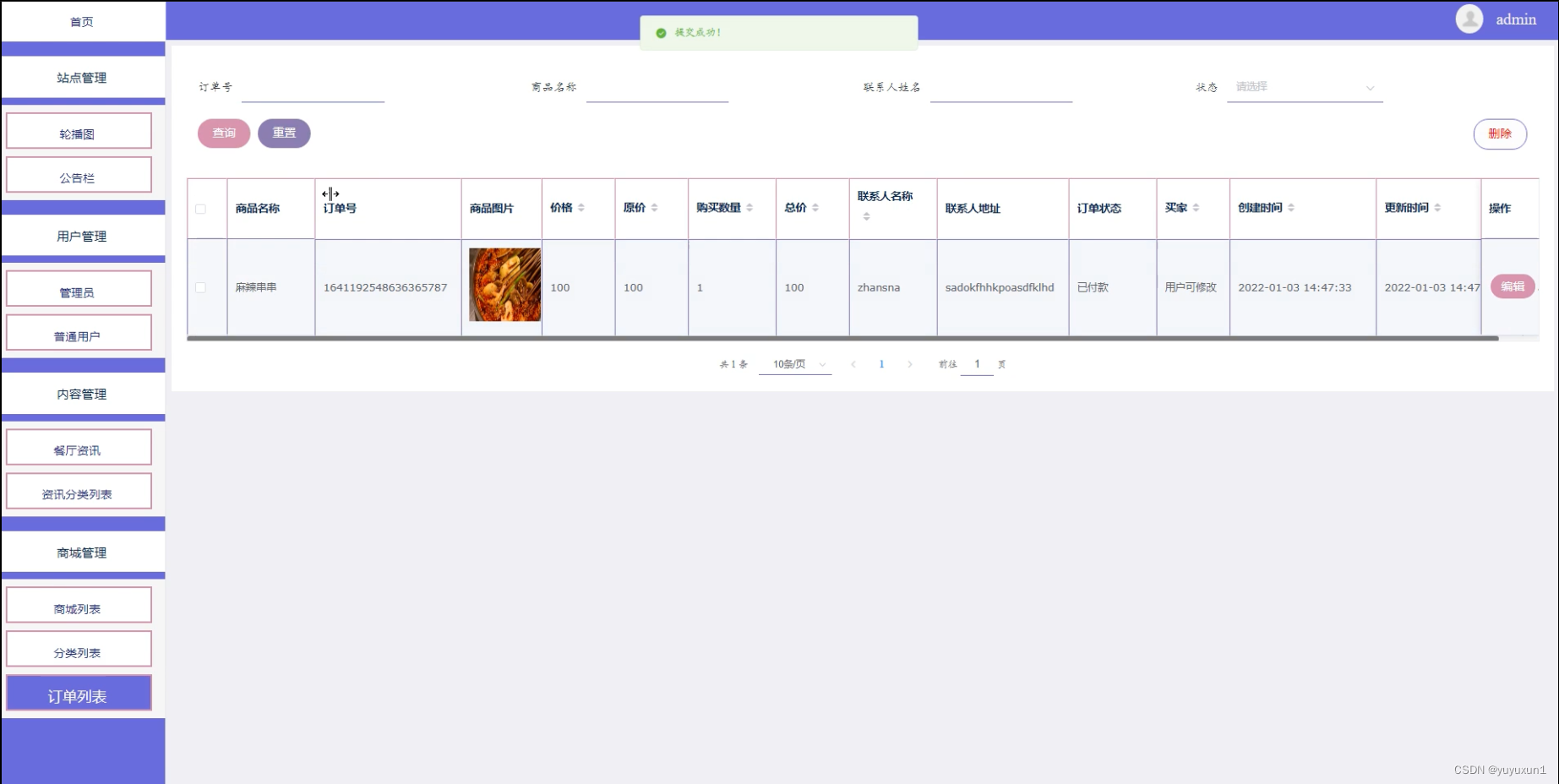 订单列表管理:对菜品信息进行维护,添加、删除、修改信息。