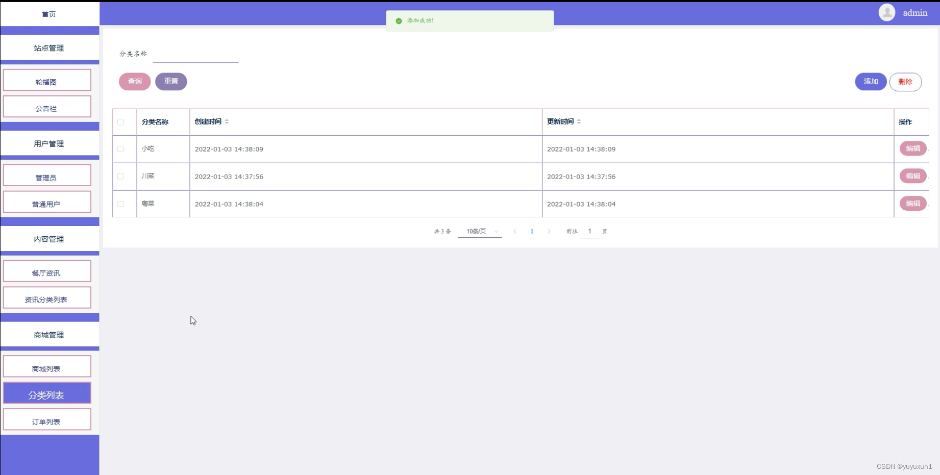 分类列表管理:对菜品分类信息进行维护,添加、删除、修改信息。