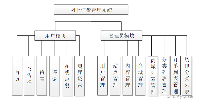 网上订餐管理系统总体分为前台用户模块和后台管理员模块。
