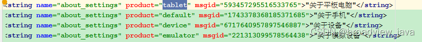 同一个字符串ID,这里有四种产品型号:平板,手机,其他设备,模拟器,这样子不同的设备上就显示了对应的"关于xx"的字符串。