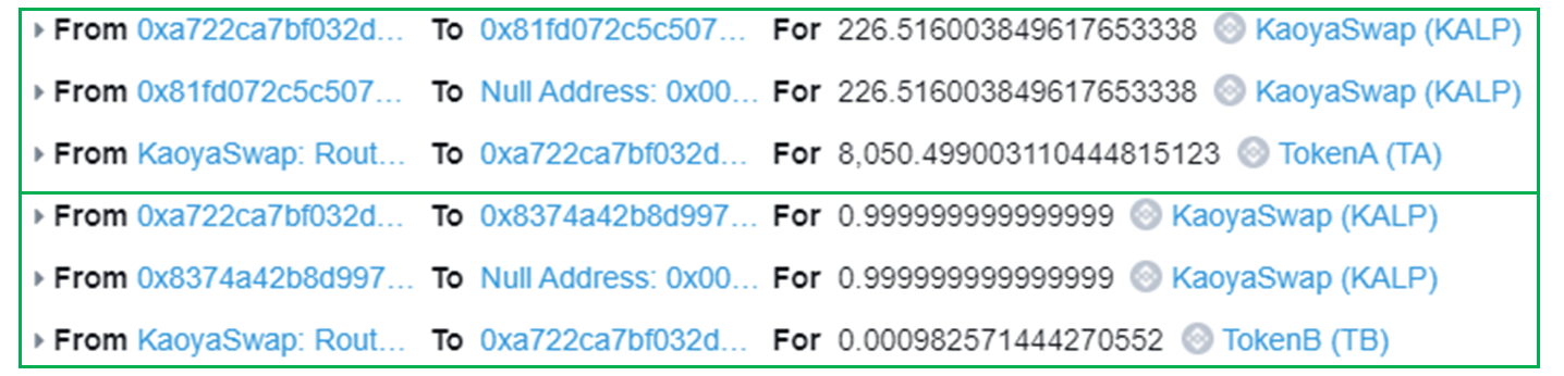 - 调用 removeLiquidity 函数,传入 0.9 KALP,获取 0.5 TA 和 1.9 TB