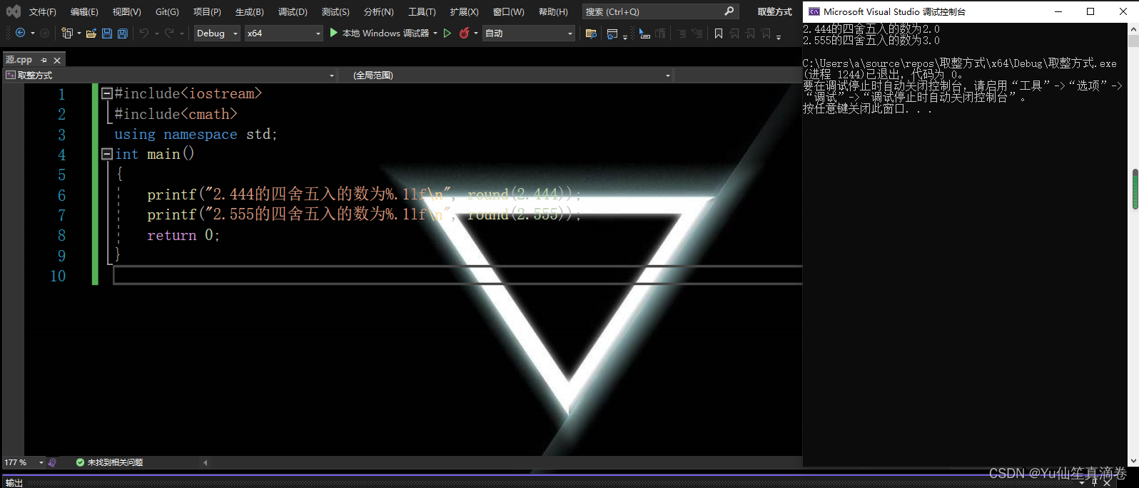 - printf("2.444的四舍五入的数为%.1lf\n", round(2.444));//四舍五入