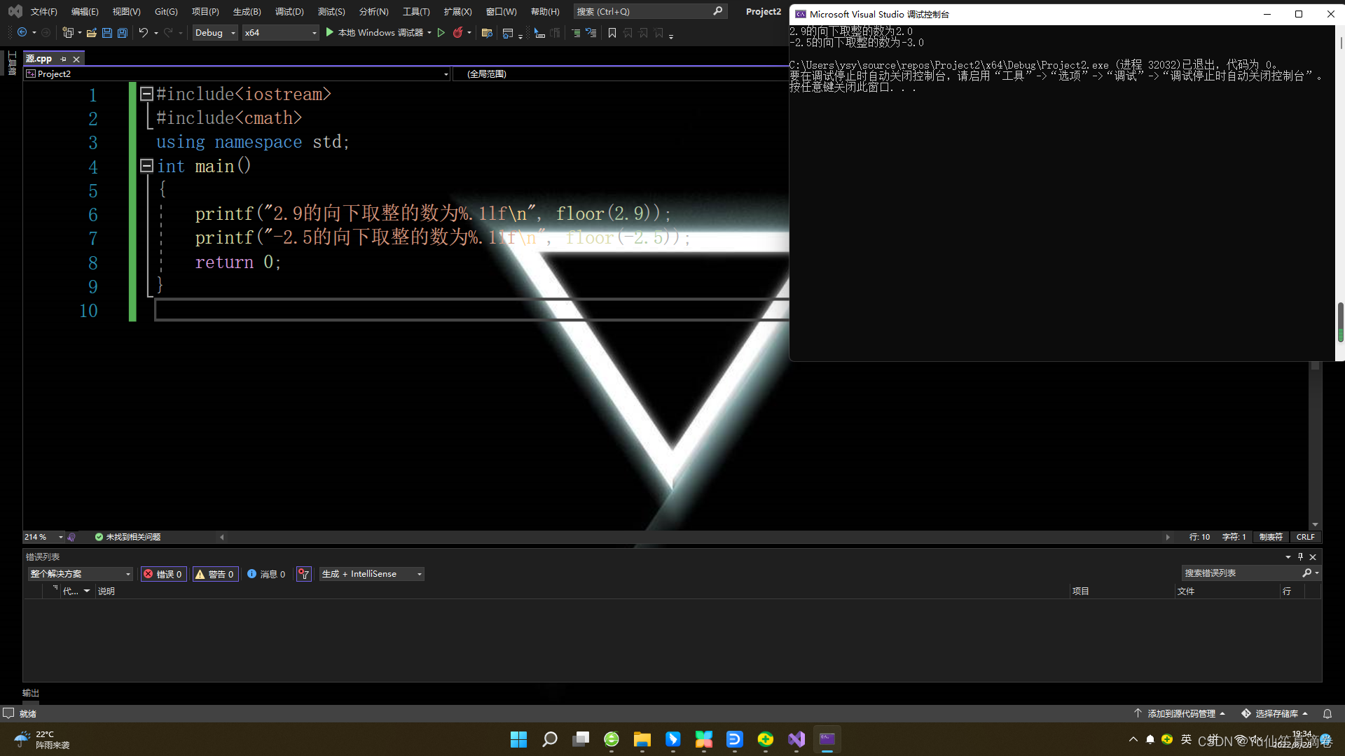 看输出结果,将2.5的小数部分0.5直接抹掉,转换为2输出,这就是C++默认的向0取整方式