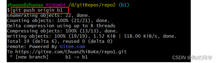 推送至远程仓库分支命令格式:git push 远程仓库简称 分支命令