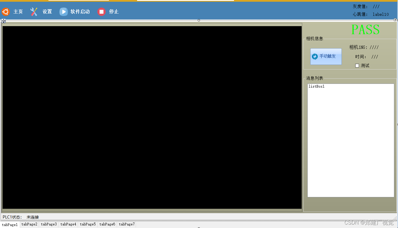 我们放两个tabControl控件,主界面的控件是在tabPage1中,设置界面我们放在tabPage2中,如果有PLC的控制,我们可以放在tabPage3中。