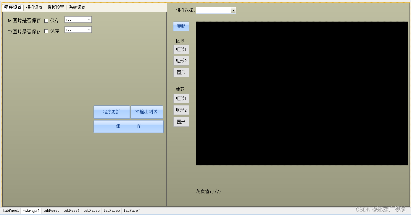 tabPage2中,我们放第二个tabControl控件,新建四个页面,分别为程序设置,相机设置,模板设置,系统设置。