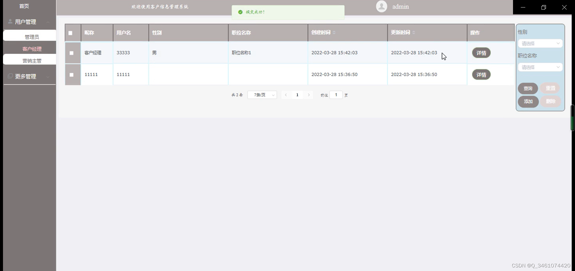 管理员登录进入客户信息管理系统可以查看首页、用户管理(客户经理、营销主管)更多管理(客户信息、客户来源、产品类型、产品信息、支付方式、服务类型、服务信息、交易信息、职位信息、客户开发进度)系统管理等信息。