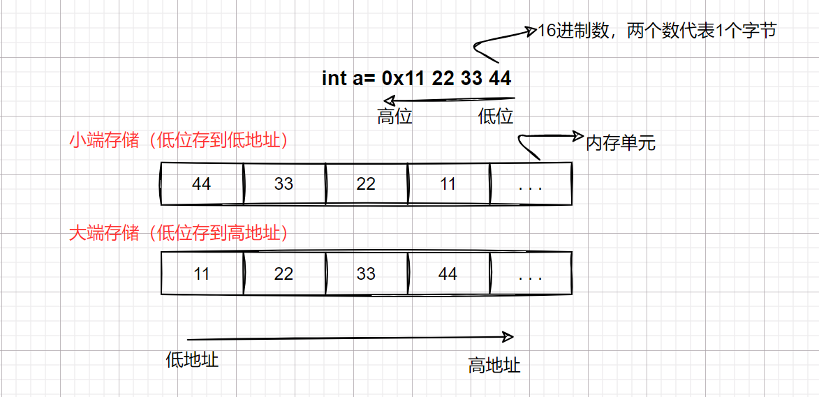 大端(存储)模式,是指数据的低位保存在内存的高地址中,而数据的高位,保存在内存的低地址 中;