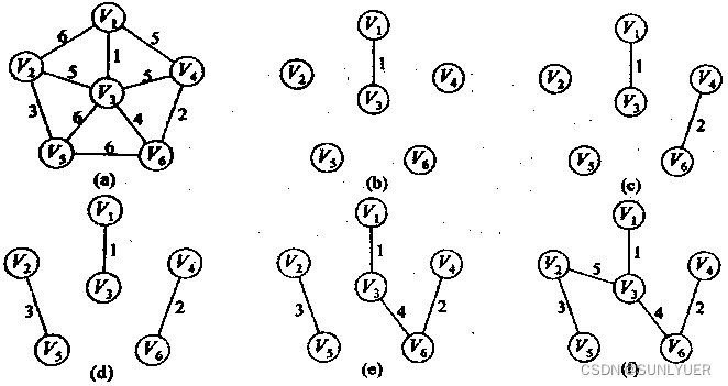 ·Kruskal算法:该算法与prim算法从顶点开始扩展不同,它按权值的递增次序选择合适的边来构造,但所选取的边不能构成环