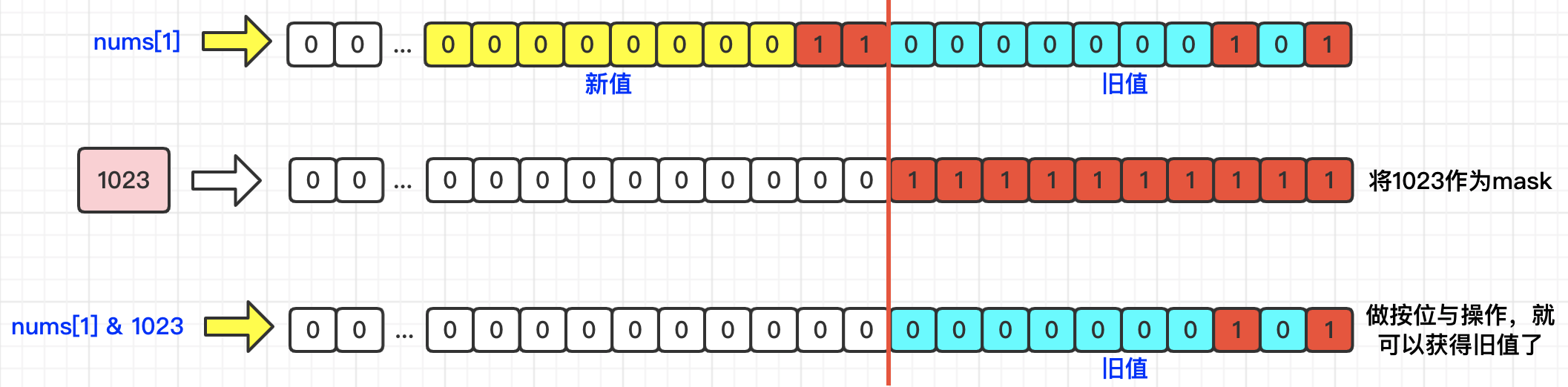 细心的同学会发现,上面的逻辑好像有问题吧,如果我们要将num[1]的值赋值给别的位置呢?此时的num[1]可是包含了新值和旧值了,那么这样不就有问题了吗?是这样的。所以,此时我们就需要1023这个值(低10位都是1)来获得nums[1]中的旧值了,具体来说,可以采用按位与(&)的方式,就可以了。具体如下图所示: