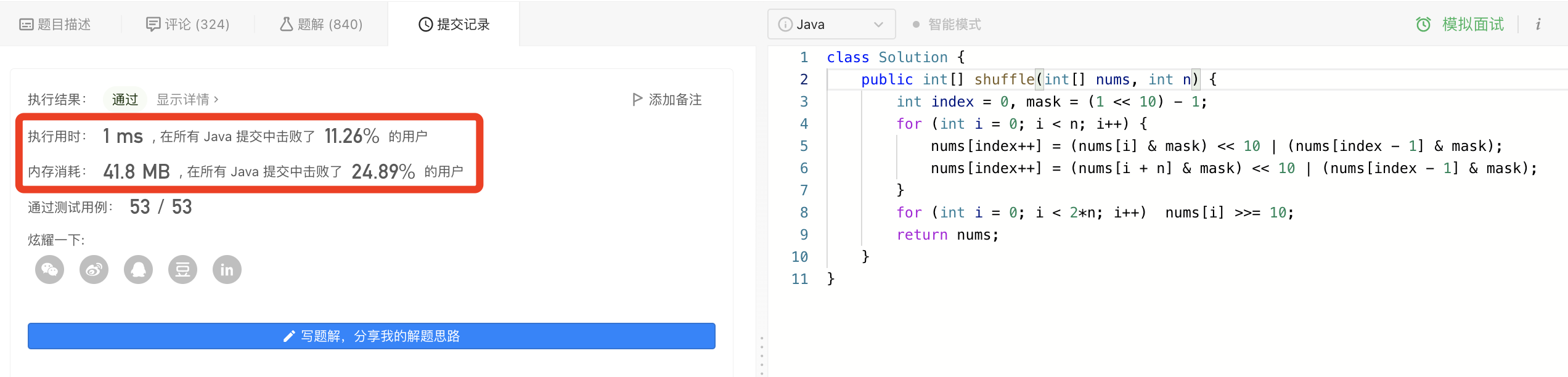 - nums[index++] = (nums[i + n] & mask) << 10 | (nums[index - 1] & mask);