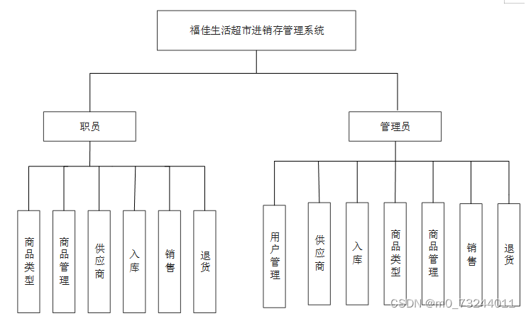 2.管理员主要负责用户管理(添加职员、删除职员、查询职员、重置信息)供应商管理(添加供应商、删除供应商)、商品管理(商品类型、入库、出库、销售、退货)、下图所示描述管理员的用例图。