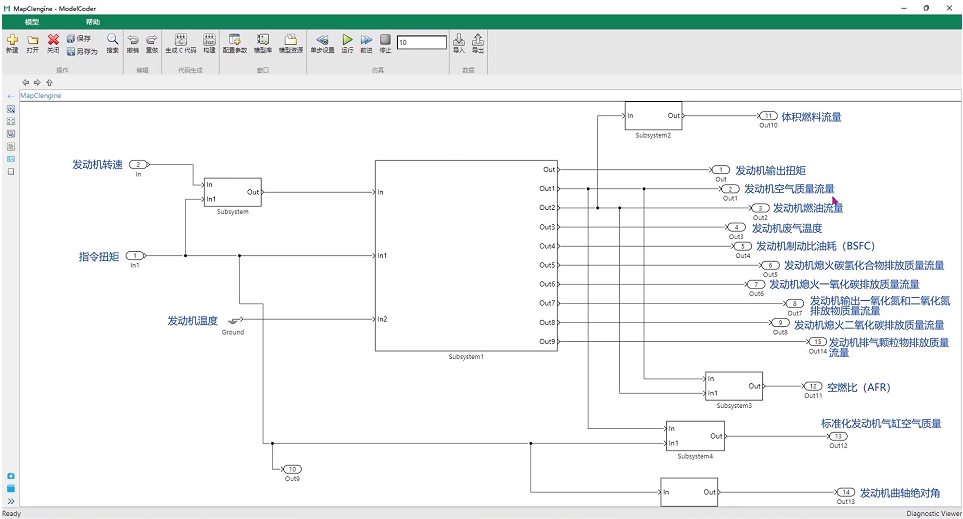 ModelCoder是一款支持多种嵌入式系统建模并可以自动生成高安全可靠的C代码的软件设计和开发工具,可实现该发动机仿真模型的搭建。具体步骤为: