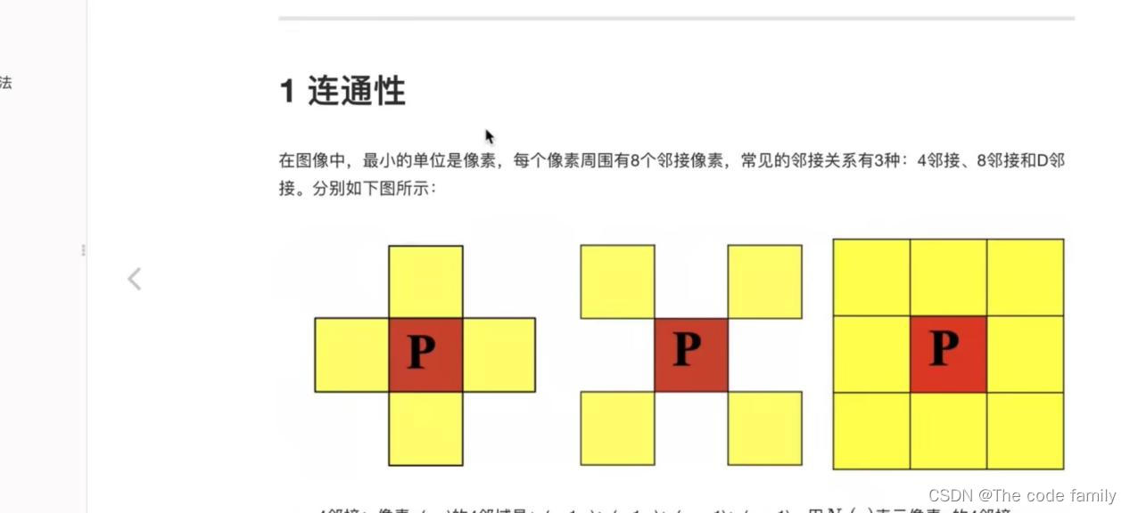 4邻接:像素p(x,y)的4邻域是:(x+1,y);(x-1,y);(x,y+1);(x,y-1),用N4(p)表示像素p的4邻接