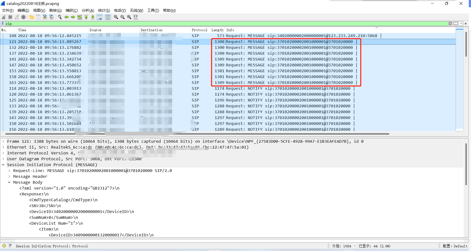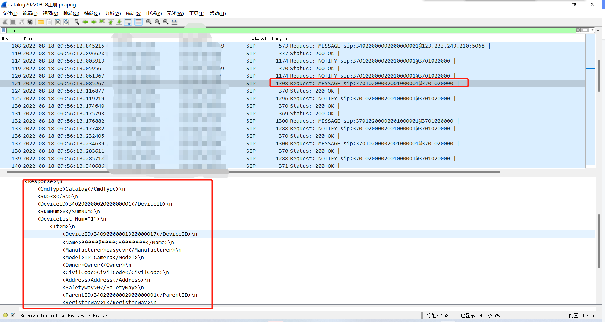 1)抓包查看下级EasyCVR在注册时,是否有传catlog消息: