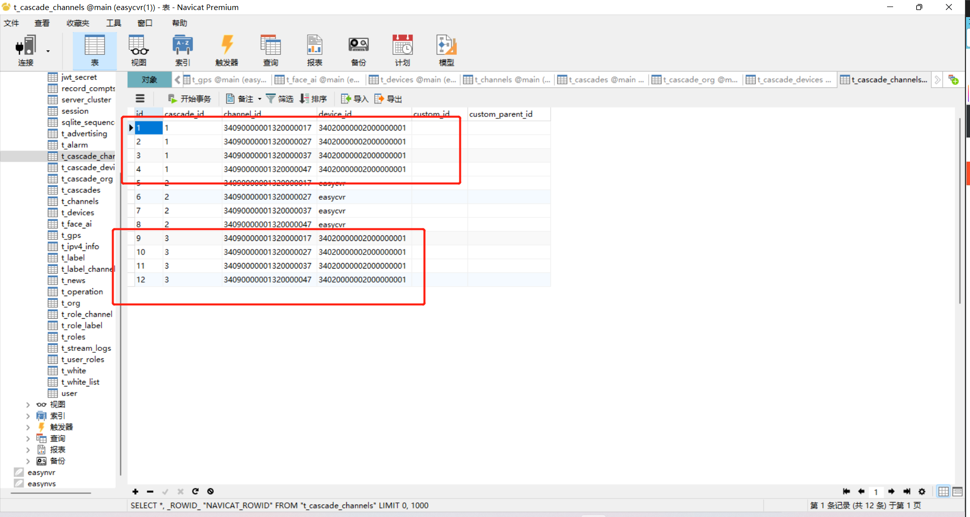 4)根据上图所示,我们发现用户设置的SIP认证用户ID重复了,里面各有4个相同通道,所以在向上级传catlog消息时,出现上述情况。我们可以根据数据库来查看: