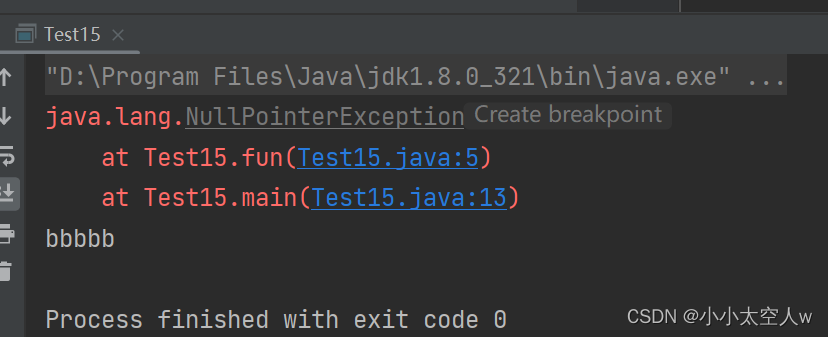 🎉可以清楚看见手动抛出异常,被捕获后,程序继续执行。异常一旦抛出,就需要被捕获,如果fun中没有捕获到,其后代码将不会执行,在其被调用者main方法中继续捕获,如果还没有捕获到,就交给JVM处理,程序异常终止,抛出的异常最终都是需要处理的,不然就会导致交给JVM处理。