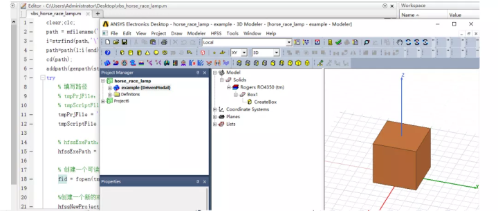在HFSS-API入门第一弹:画个Box中对hfssBox函数的使用进行了详细介绍,如果再加上修改Box的颜色的透明度,加上延时操作,就可以利用MATLAB编写vbs脚本,在HFSS中Run Script实现“跑马灯”效果。