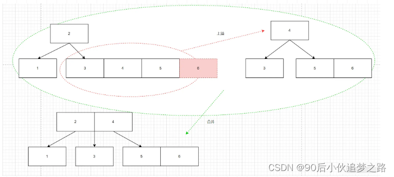 接着插入6,由于不能超过4节点又要进行节点上溢了,这里4上溢,然后形成的新树和2要进行合并。