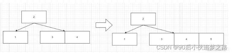 接着我们插入4,但是234树最多就是4节点,不能直接接在后面了。我们需要进行一步节点上溢操作。上溢中间的节点2,形成一个新的二节点,然后4就接在3后面。接着插入5就直接接在4后面形成4节点了。