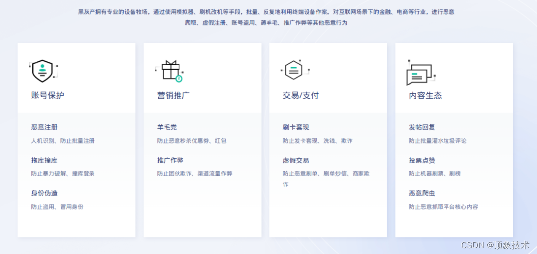 设备指纹作为顶象防御云的一部分,集成了业务安全情报、云策略和数据模型,通过用户上网设备的硬件、网络、环境等特征信息生成设备的唯一标识,覆盖安卓、iOS、H5、小程序,可有效识别模拟器、刷机改机、Root、越狱、劫持注入等风险。