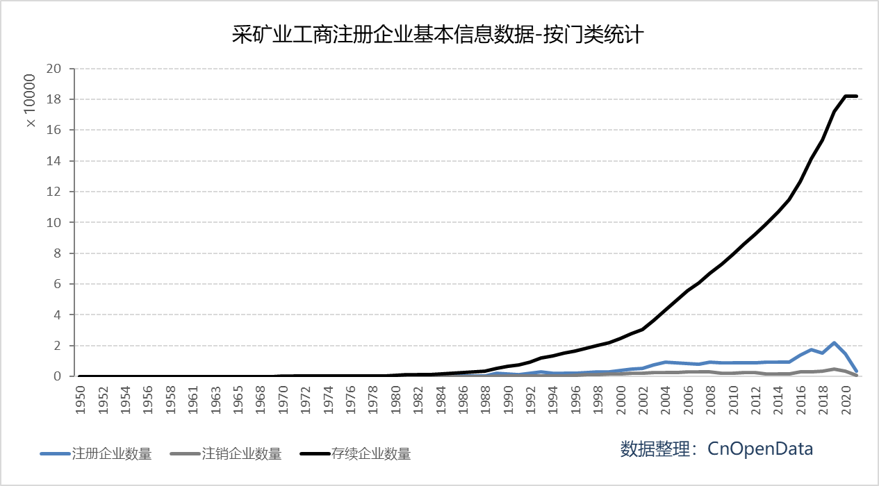 CnOpenData依据国民经济行业分类,整理了我国1950年至2021年的采矿业工商注册企业基本信息。本数据下分煤炭开采和洗选业、石油和天然气开采业、黑色金属矿采选业、有色金属矿采选业、非金属矿采选业、开采专业及辅助性活动、其他采矿业七大类,生动展现了我国建国以来采矿业的发展历程。