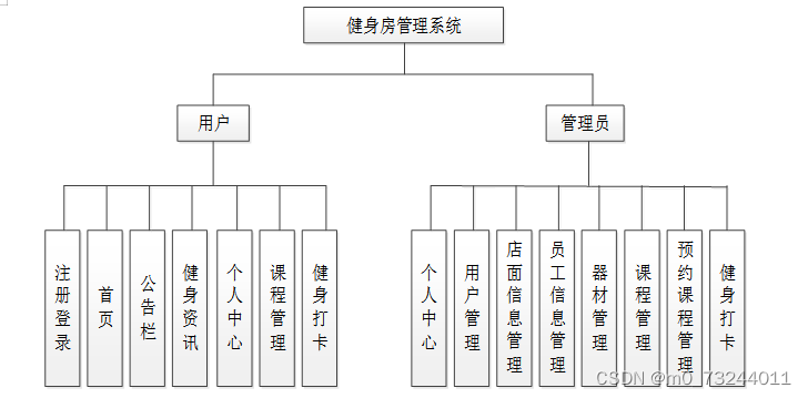 根据用户对系统的需求,要求系统简单操作,能够准确,完整的对信息进行管理。健身房管理系统在对需求做解析后,整个系统主要分为两个部分:管理员和普通用户,每个模块下的分支功能不一样。对功能做出如下说明: