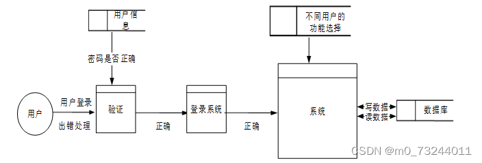 系统顶层数据流:外部实体为用户,第一个流程为登录验证,用户信息表返回密码验证,是否正确,正确则登录系统,错误则反馈信息,登录系统后,根据不同用户的功能选择,来读写数据库。