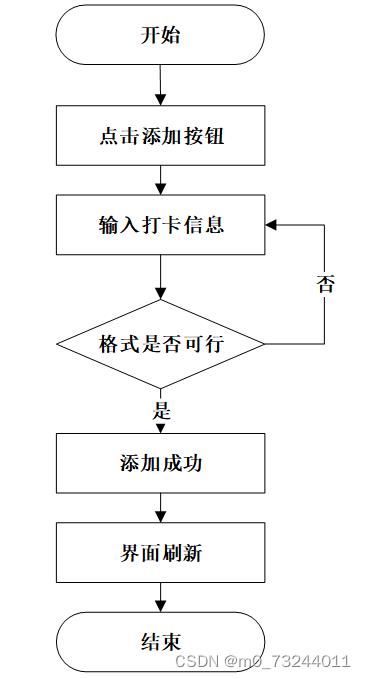 健身打卡管理包括新增打卡时间、删除健身打卡、健身打卡查询打卡状态等,以健身打卡新增为例,在视图层请求健身时间新增,反馈后,调用业务逻辑层,通过业务逻辑层的接口调用底层的数据逻辑层完成数据库联动操作。