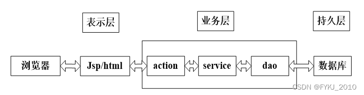 页面发送请求给控制器,控制器调用业务层处理逻辑,逻辑层向持久层发送请求,持久层与数据库交互,后将结果返回给业务层,业务层将处理逻辑发送给控制器,控制器再调用视图展现数据。