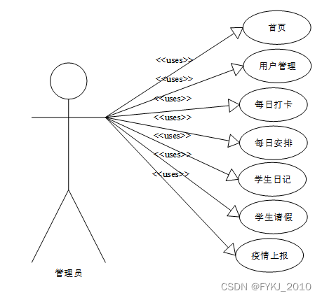 高校学生健康打卡系统在对需求做解析后,整个系统主要分为三个部分:管理员、教师和学生,每个模块下的分支功能不一样。对功能做出如下说明: