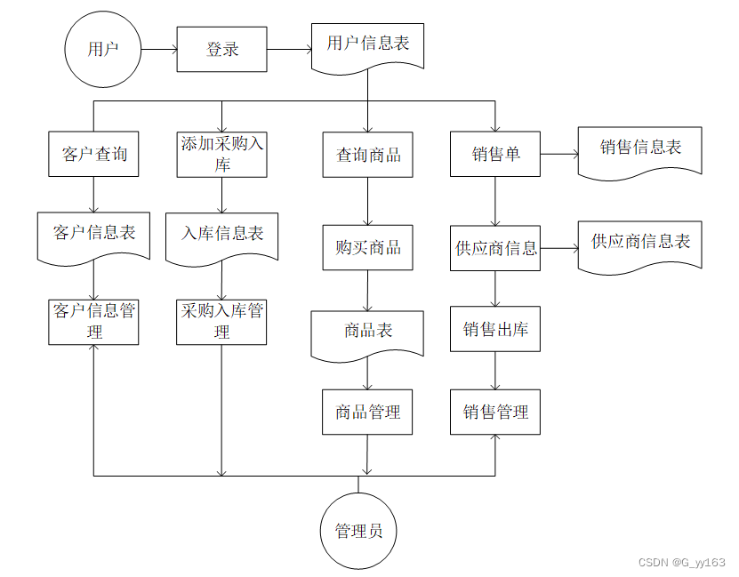2.管理员主要负责用户管理、销售单、供应商信息、客户信息、商品信息、采购单、采购入库、销售出库,下图所示描述管理员的用例图。