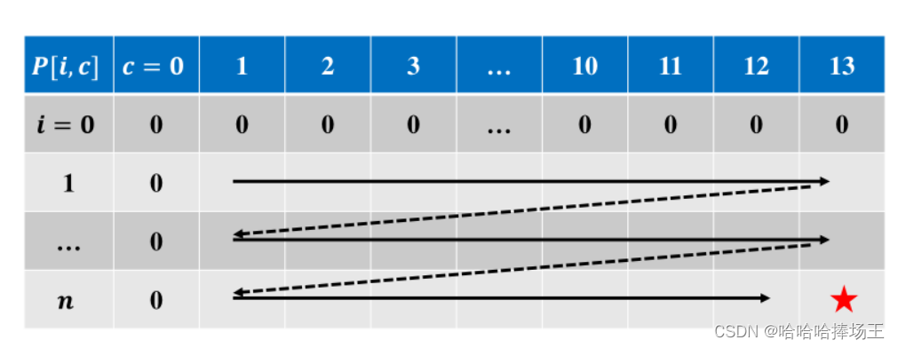 records[i +1][c]=false;}return memorandums[i +1][c];}// 自底向上:递推计算privatestaticvoidKnapsackDP(int[][] arr,int i,int c,int[][] memorandums,boolean[][] records){for(int i1 =1; i1 <= i; i1++){for(int i2 =1; i2 <= c; i2++){int v = arr[i1 -1][1];int p_i = arr[i1 -1][0];if(i2 < v){