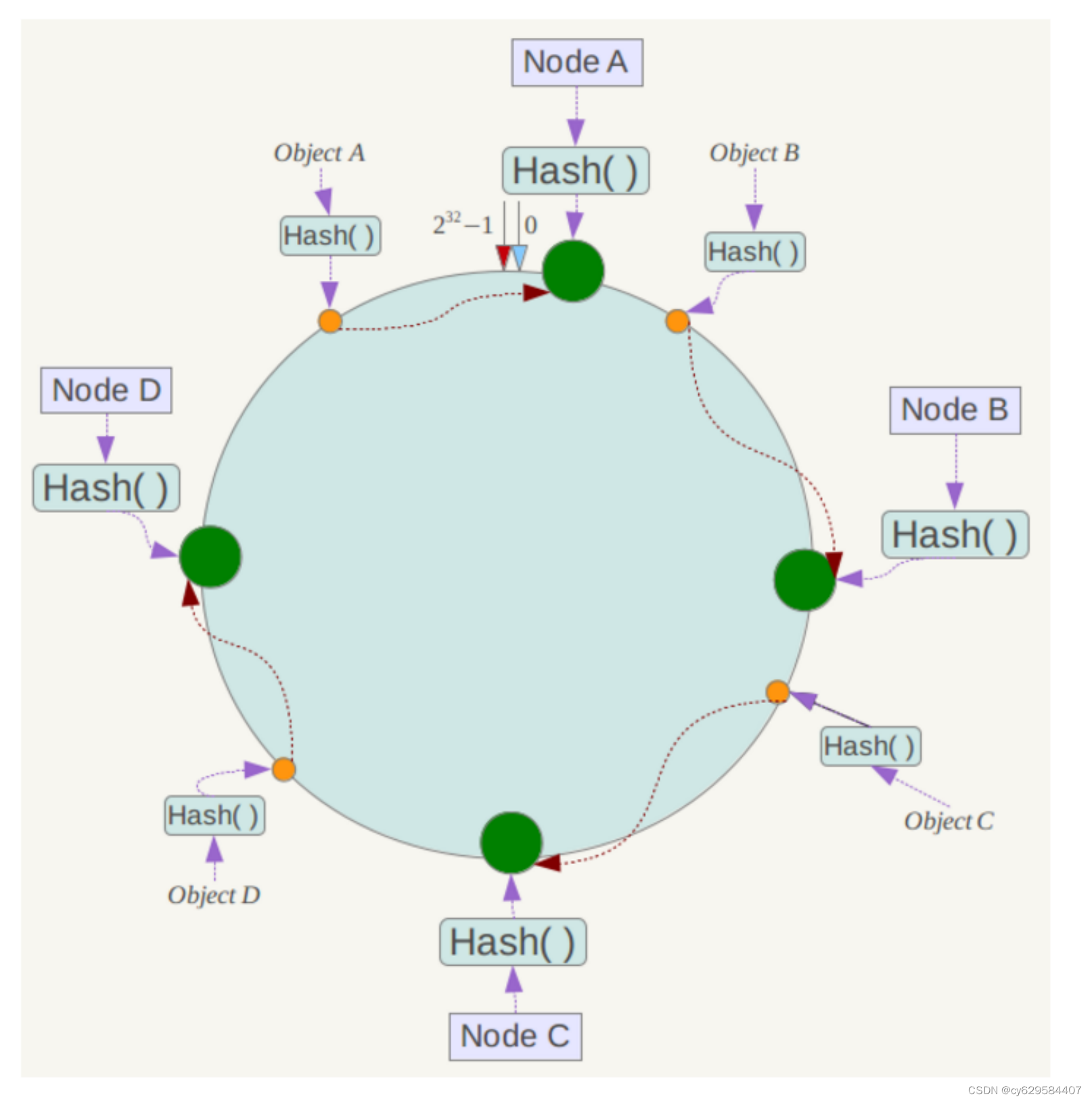 四个数据对象,经过哈希计算后,在环空间上的位置如下: