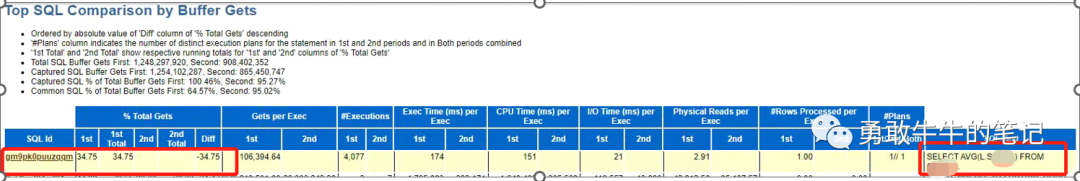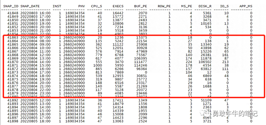 通过awr对比异常时间段8月4号11点-12点与正常时间段8月10号11点-12点的job存储过程SP_XXXXX_STATISTICS_RUYUE执行消耗差异,可以看到执行时间增长了1000+秒,主要的消耗在于逻辑读