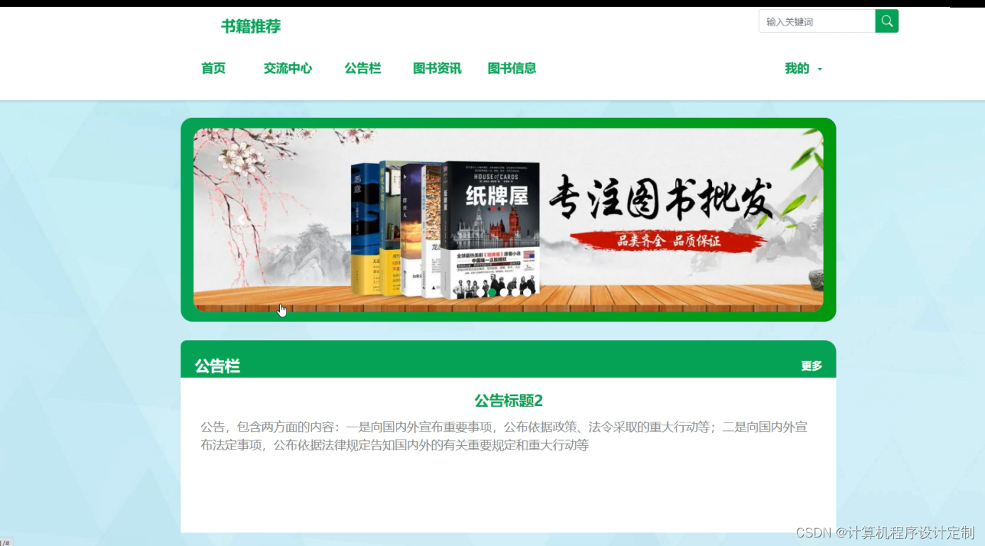 书籍推荐系统,在系统首页可以查看首页、交流中心、公告栏、图书资讯、图书信息等内容,如图5-1所示。