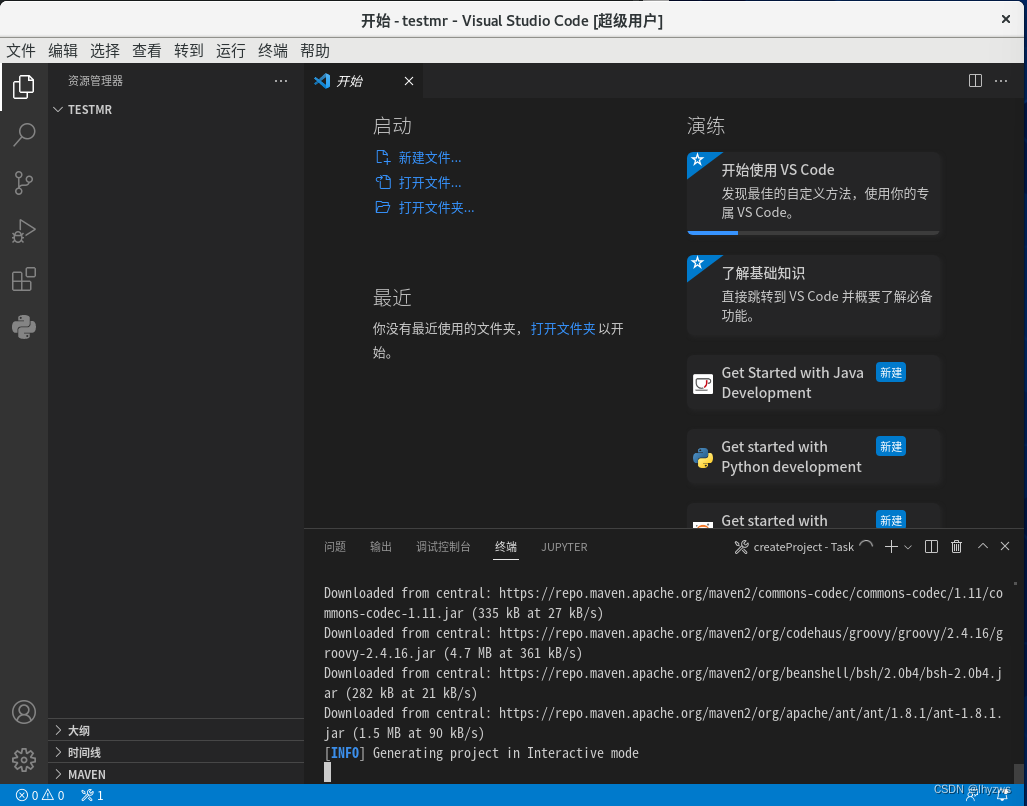 新建一个testmr文件夹作为工作空间(比如本例在/root/testmr处),在该文件下环境下启动CODE。然后在文件标签页下面,也就是testmr这个空的工作空间下,右键,选择从Maven原型创建新项目: