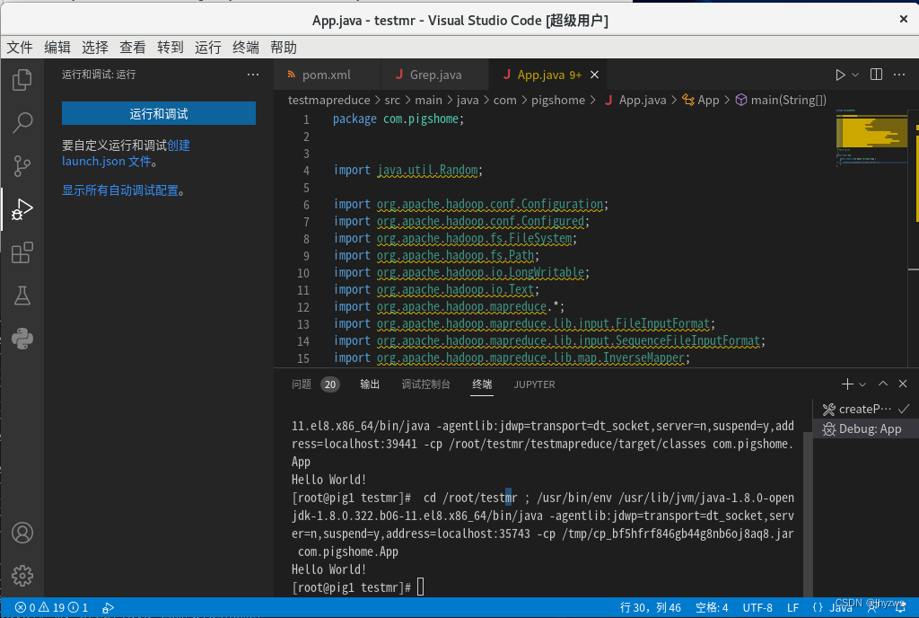 选择调试标签,点击“运行和调试”,会启动当前打开的文件,也就是App.java。环境配置正常的话,应该会不出意外的输出“hello world!”。