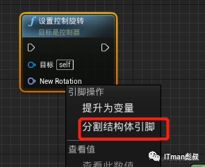 其中目标是Pawn自己,New Rotation表示要设置的新的旋转的值,是一个向量,该属性还可以进行分割成三个分量,x,y,z。之所以要分割是因为我们左右旋转,只需要改变Z轴方向的旋转。
