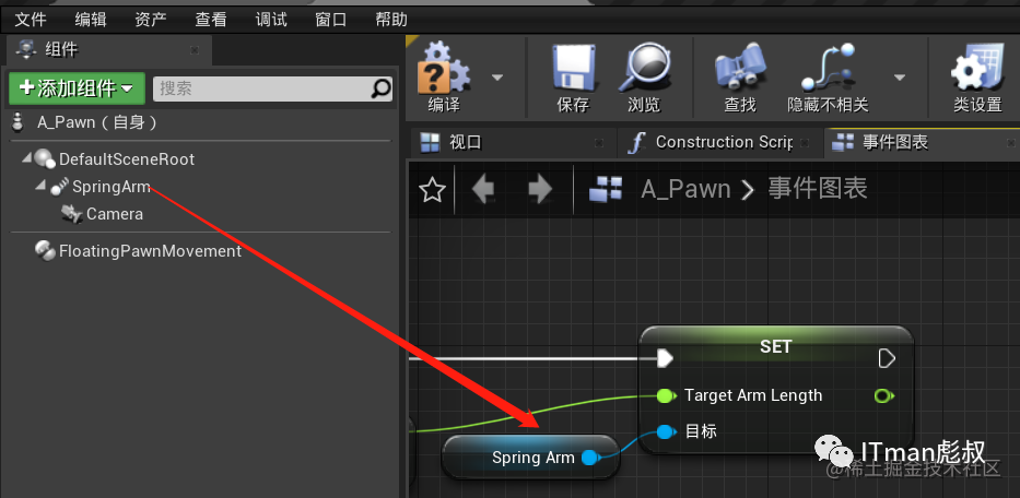 然后设置弹簧臂的长度,可以拖拽弹簧臂组件到蓝图中:
