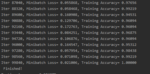 print('Iter' + str(step * batch_size) + ', Mini-batch loss= ', + '{:.6f}'.format(cost) + ', Training Accuracy=' + '{:.5f}'.format(acc))