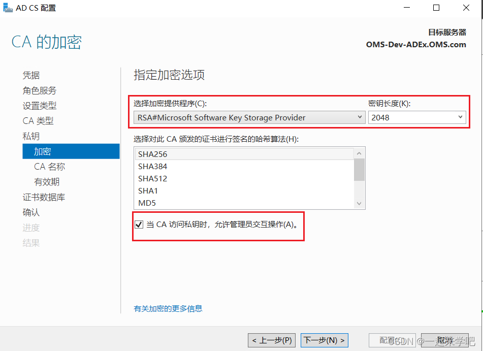 6、勾选【当CA访问私钥时,允许管理员交互操作】,点击【下一步】