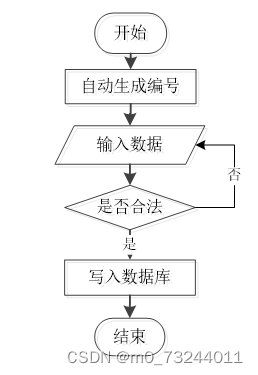 用户成功登入系统后就能够实现增加数据的操作,增加数据的编号是特定的,系统生成,用户不能随意填写,除了编号以外,其他增加信息用户自己填写,填写后的信息经过系统验证,验证合法通过就显示增加数据成功了,相反的话,就没有增加成功,图2-1显示的就是在增加数据时的流程。