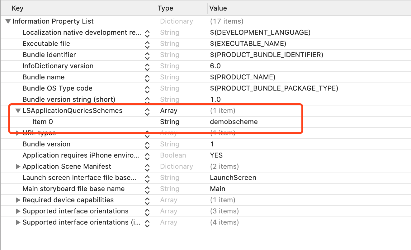 在 Info.plist 中添加 LSApplicationQueriesSchemes字段,该字段对应的是数组类型,然后添加键值为DemoBScheme(DemoB的Scheme)