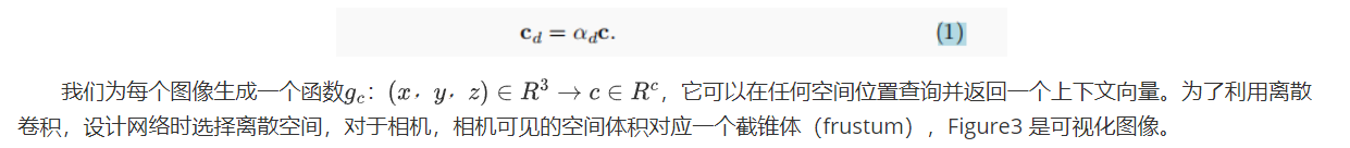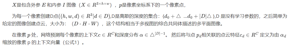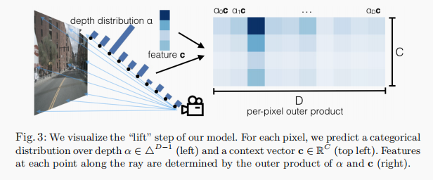对相机图片单独处理,将对每一个图像提取的feature map 从的2D的图像坐标系统转换成以车辆中心为原点的3D坐标系中,这个转换参数在相机之间是共享的;单目传感器融合的难点在于需要将深度信息转换为参考帧坐标,但与每个像素的depth是未知的。 本论文提出的解决方案是为每个像素生成所有可能深度的表示。(为每一个模型生成离散的深度值,模型训练阶段像素自行选择合适的深度值)。
