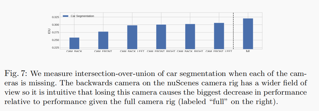检测当某个位置相机缺失时,语义分割指标IOU分数的变化,正常情况下的IOU是“full”,可以看出“CAM BACK ”相机缺失时对鲁棒性的影响是最大的,也是因为nuScenes数据集中后置相机拥有很大的视野的原因导致的。 之后训练的时候使用6个相机中的4个相机,在测试的时候分别增加不同位置的相机,发现测试的性能是提升的。